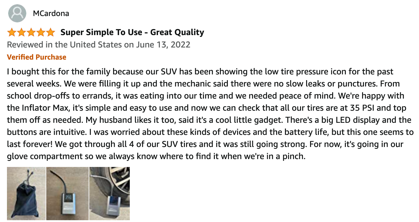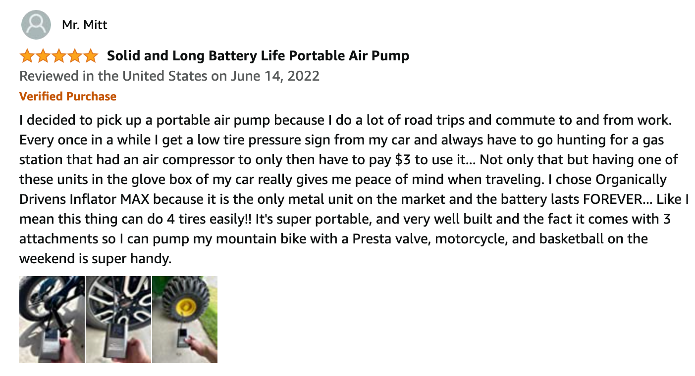 With our newly updated design, bigger battery, (like big enough to pump up 10 tires), and ALL METAL body and motor, Inflator MAX will not disappoint.